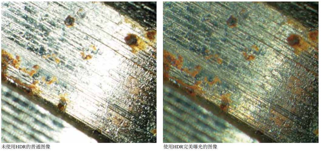 HDR功能可以使圖像中高亮和黑暗區(qū)域的細(xì)節(jié)同時呈現(xiàn)。Stream軟件中的HDR算法可以自動以不同的曝光時間拍攝一系列圖像,并在極短時間內(nèi)創(chuàng)建各個區(qū)域分別曝光后的合成圖像。非常適合拍攝金相或PCB行業(yè)中那些同時具有高反射和低反射區(qū)域的樣品。